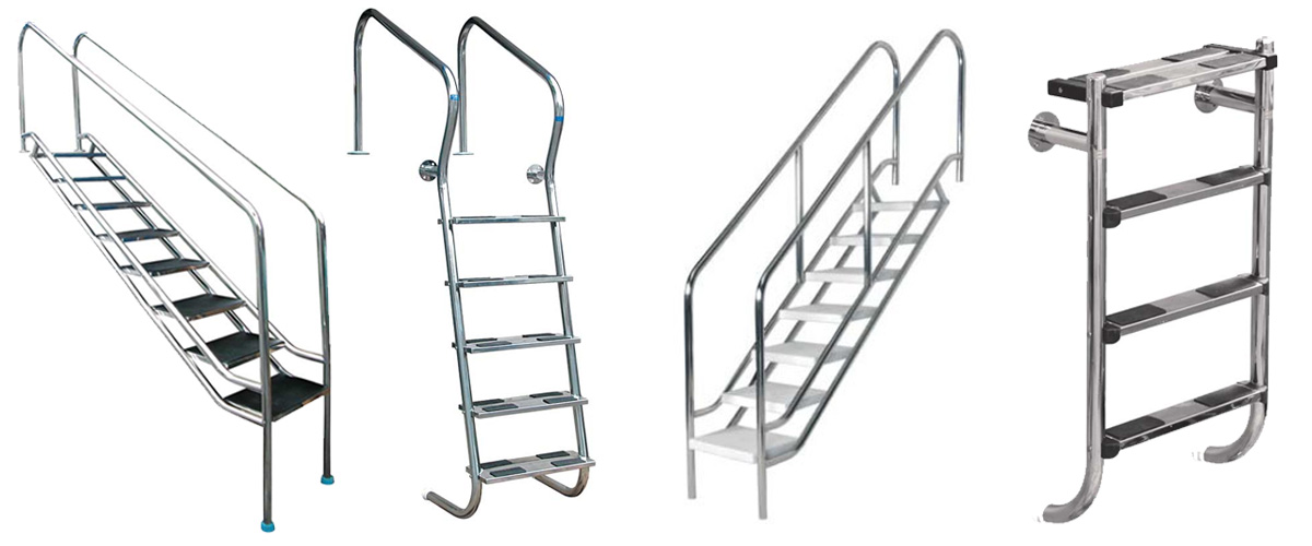 Genislik 500 mm. Kollar Ø 42 mm AISI 304 paslanmaz çelik borudan, paslanmaz çelik basamaklari, plastik ankrajlari ve rozetleri ile komple.